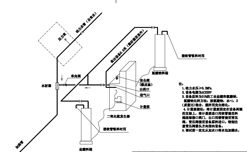 | 型號(hào) | 有效氯產(chǎn)量(克/小時(shí)) | 配電功率(千瓦) | 管徑DN | 動(dòng)力水壓力(Mpa) | 重量(公斤) | 設(shè)備占地面積(平方米)×高 (毫米) |